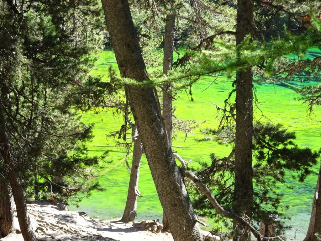 Après une marche facile sur une piste puis un sentier en pleine forêt de mélèzes, le petit lac couleur vert fluorescent (!) se dévoile à 1830 m d’altitude, au pied des sommets des Rois Mages. Sa couleur incroyable est due à une algue présente dans ses eaux.